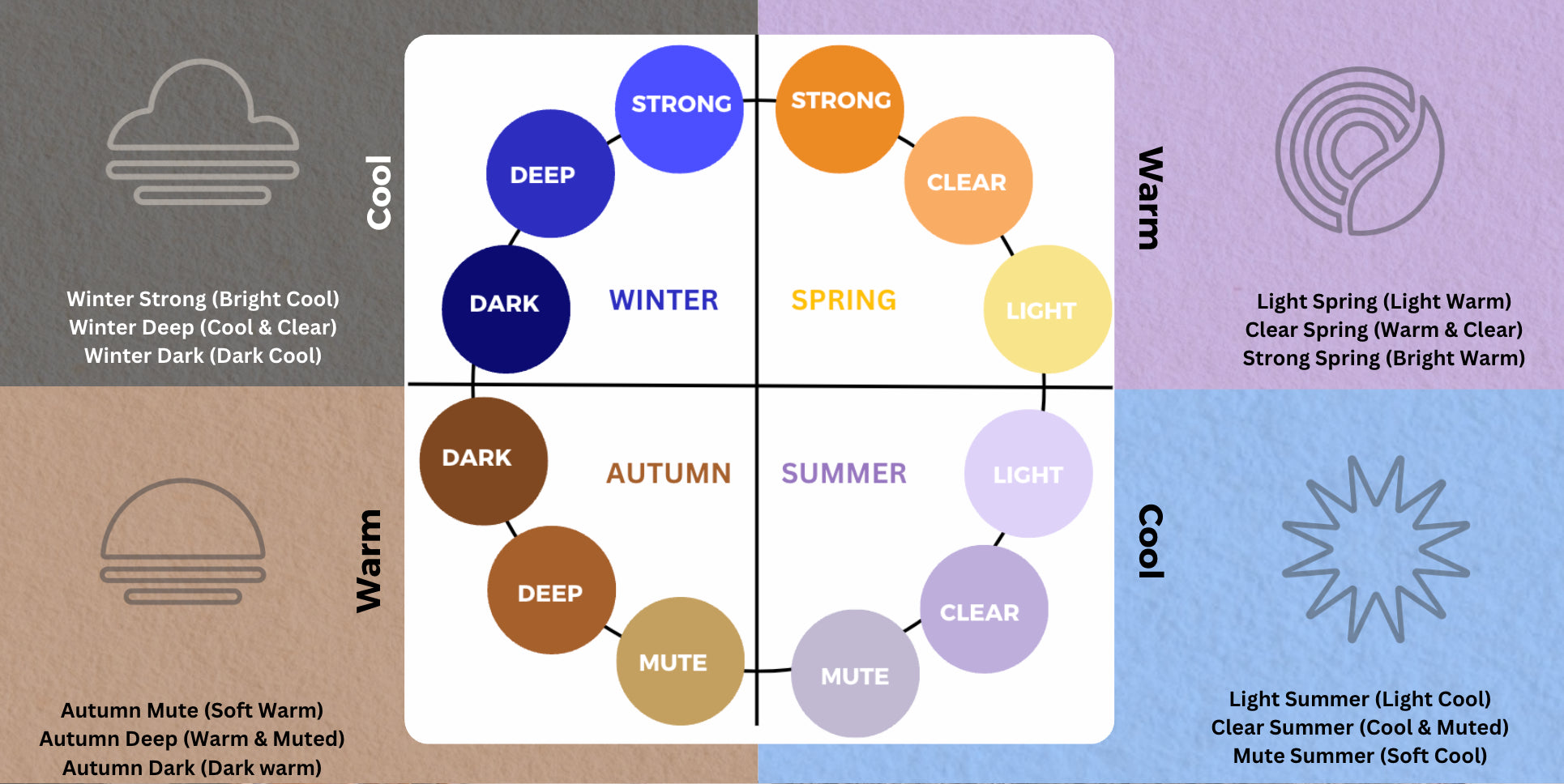 Here we have the 12-seasonal colour wheel, featuring Light Summer, Clear Summer, Soft Summer, Soft Autumn, Deep Autumn, Dark Autumn, Dark Winter, Deep Winter, Strong Winter, Strong Spring, Clear Spring, and Light Spring. The brighter, clearer seasons sit at the top of the wheel, while the softer, more muted seasons like Summer and Autumn are positioned at the bottom. Many seasons fall into a more neutral zone, whereas the only truly warm or cool seasons have a sister season within their same category.